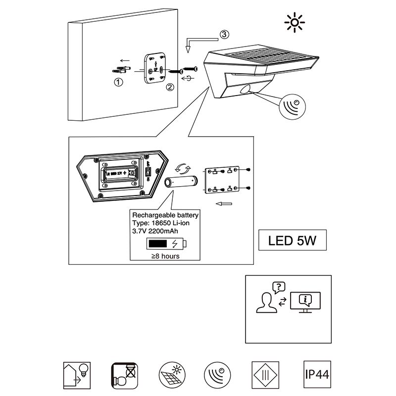 Diese Solarleuchte funktioniert mit Sonnenenergie. Solarlampen schalten sich automatisch ein, wenn es dunkel ist, und aus, wenn es hell wird. Es ist wichtig, dass die Lampe genügend Sonnenlicht erhält, damit der Akku richtig aufgeladen werden kann. Der Vorteil der Solarenergie ist, dass Sie keine Kabel verlegen müssen.