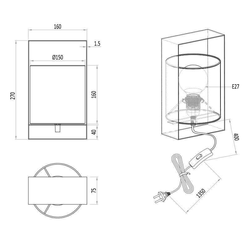 • 1 x E27 Fassung (exkl. Leuchtmittel)
