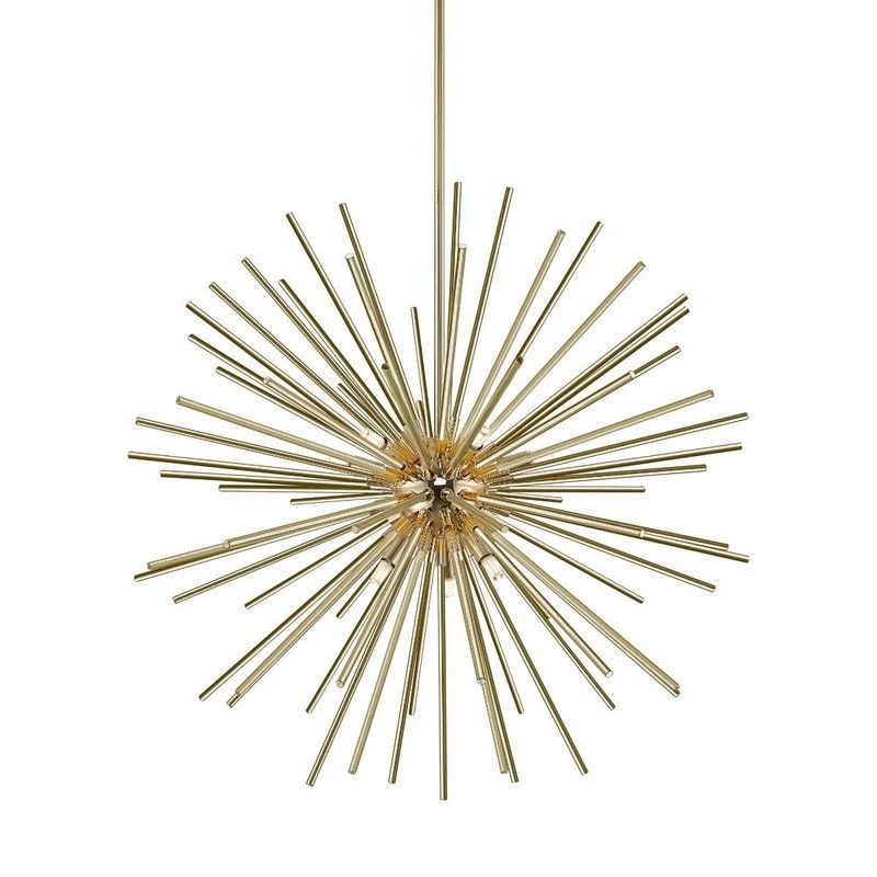 Die design Pendelleuchte Milos ist in der Farbe Gold und aus Glas gefertigt. Die goldene Pendelleuchte wird ohne passende Leuchtmittel geliefert. Diese Lampe benötigt 9 Lichtquellen mit G9-Fassungen. Die maximale Wattleistung der Lichtquellen ist 42 Watt.