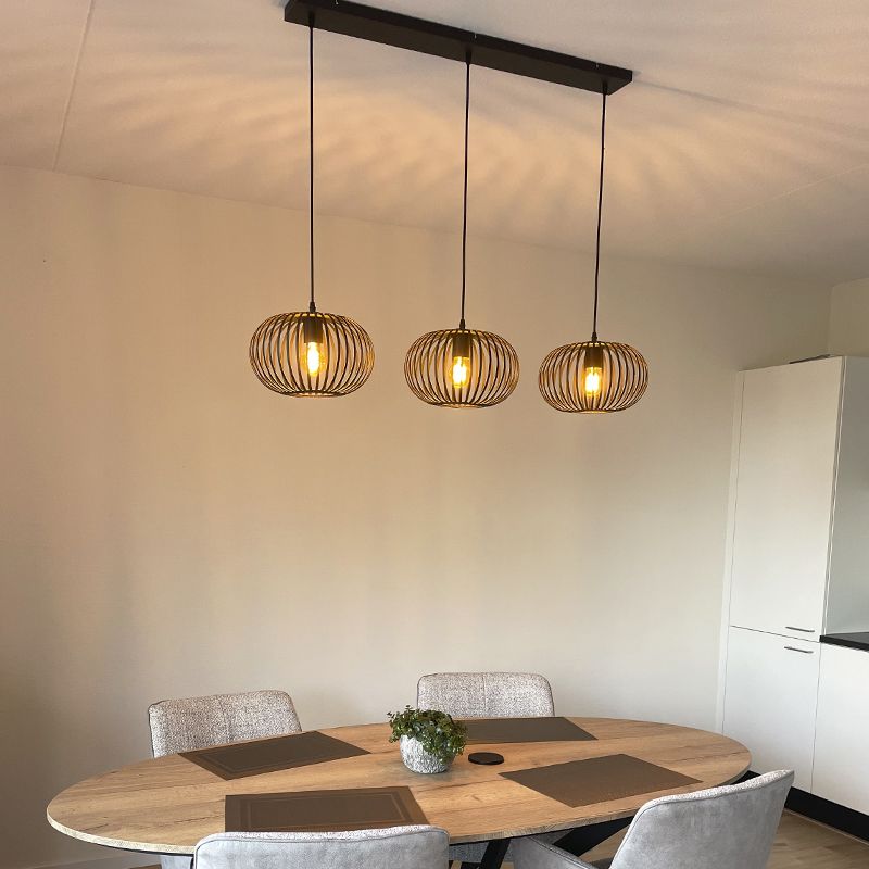 Die industrielle Pendelleuchte Lieve ist in der Farbe Schwarz und aus Metall gefertigt. Die schwarze Pendelleuchte wird ohne passende Leuchtmittel geliefert. Diese Lampe benötigt 3 Lichtquellen mit E27-Fassungen. Die maximale Wattleistung der Lichtquellen ist 60 Watt.