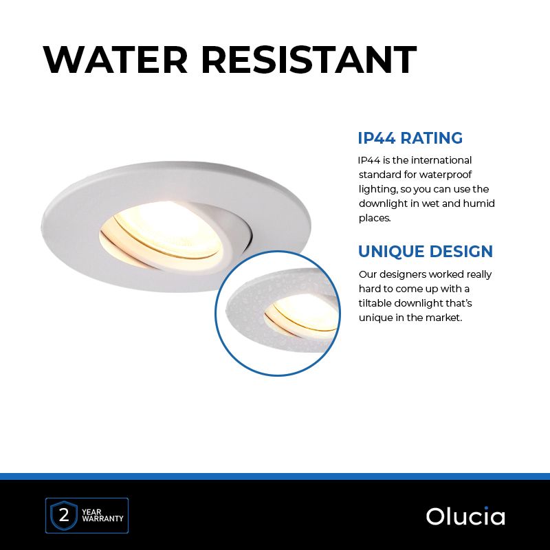Die weiße Aluminium Einbaustrahler hat den IP-Wert IP44 (wasserdicht). Damit eignet sich die Lampe für Orte, an die Wasser und Feuchtigkeit gelangen können. Diese Leuchte ist daher für Badezimmer oder andere Feuchträume geeignet.
