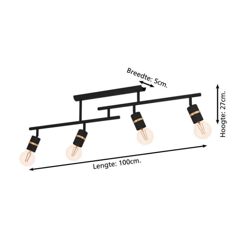 Der schwarze Deckenstrahler Jelger ist aus Aluminium hergestellt. Der schwarze Deckenstrahler wird ohne passende Leuchtmittel mit E27-Fassung geliefert. Die Leuchte benötigt 4 passende E27-Lichtquellen mit einer maximalen Leistung von 10 Watt.