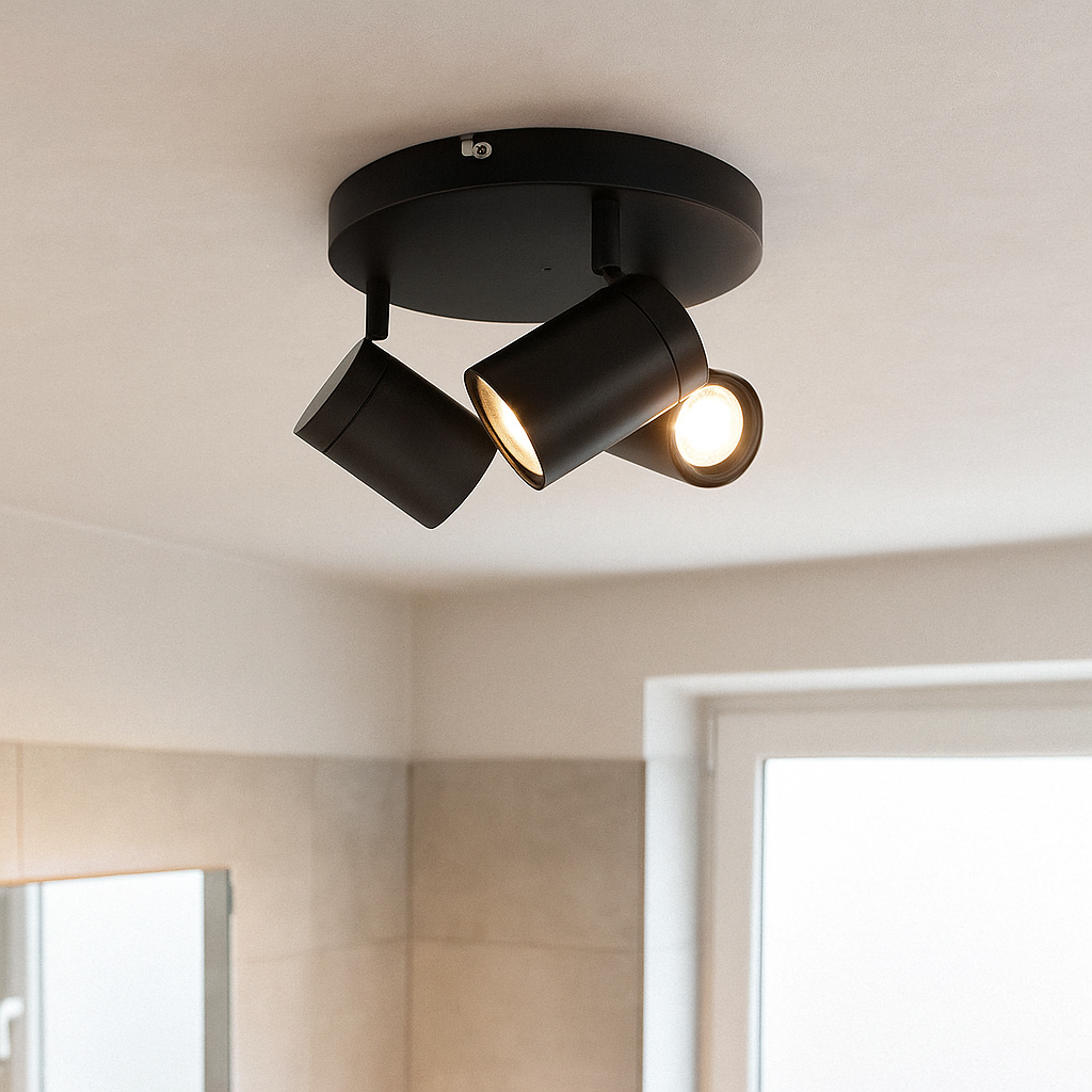 Die schwarze Aluminium Deckenleuchte hat den IP-Wert IP44 (wasserfest). Diese Lampe eignet sich für Orte, an die viel Wasser und Feuchtigkeit gelangen können. Zum Beispiel im Badezimmer oder in anderen Feuchträumen.